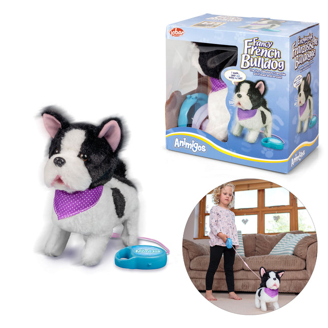 Plush French Bulldog that has a range of animated features. Push the button on his long lead and this little puppy will walk forward or pause to bark. It has a lovely, black and white coat and a fetching purple bandanna. Comes with a pink brush for grooming. Part of the Animigos range.